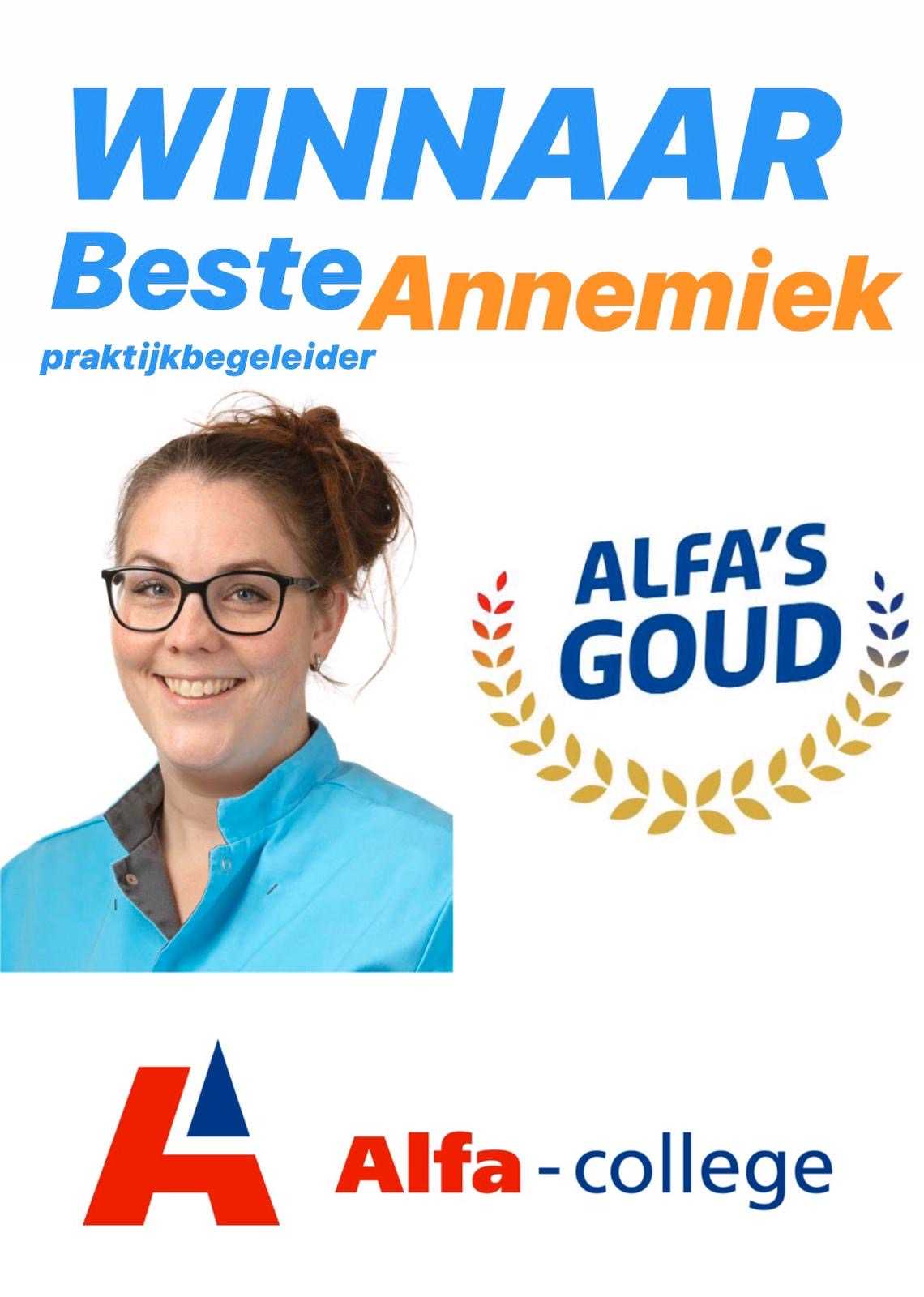 Wij feliciteren onze collega Annemiek! Gewonnen in de categorie ‘Beste praktijkbegeleider’ Alfa’s GOUD!